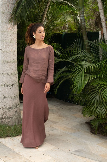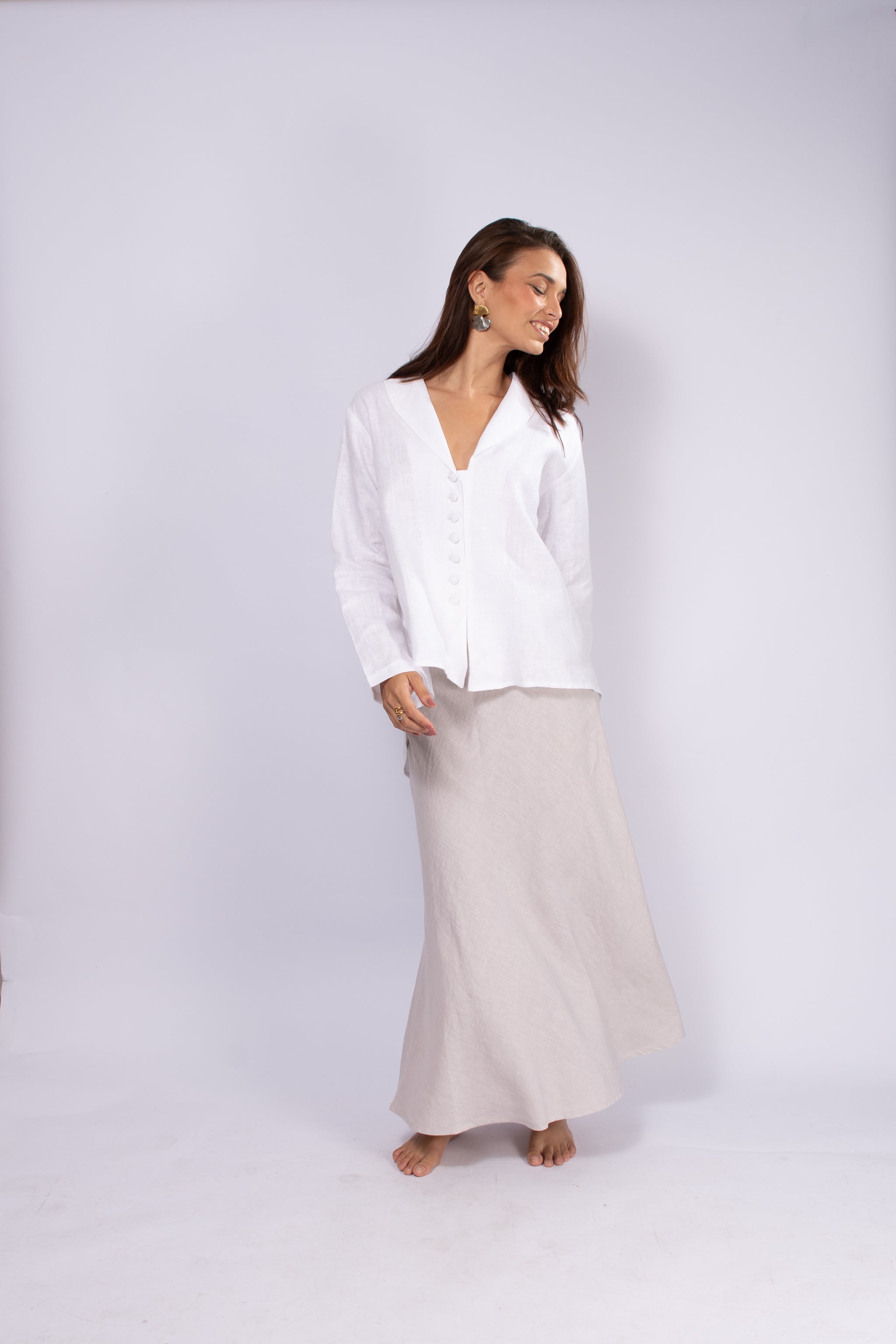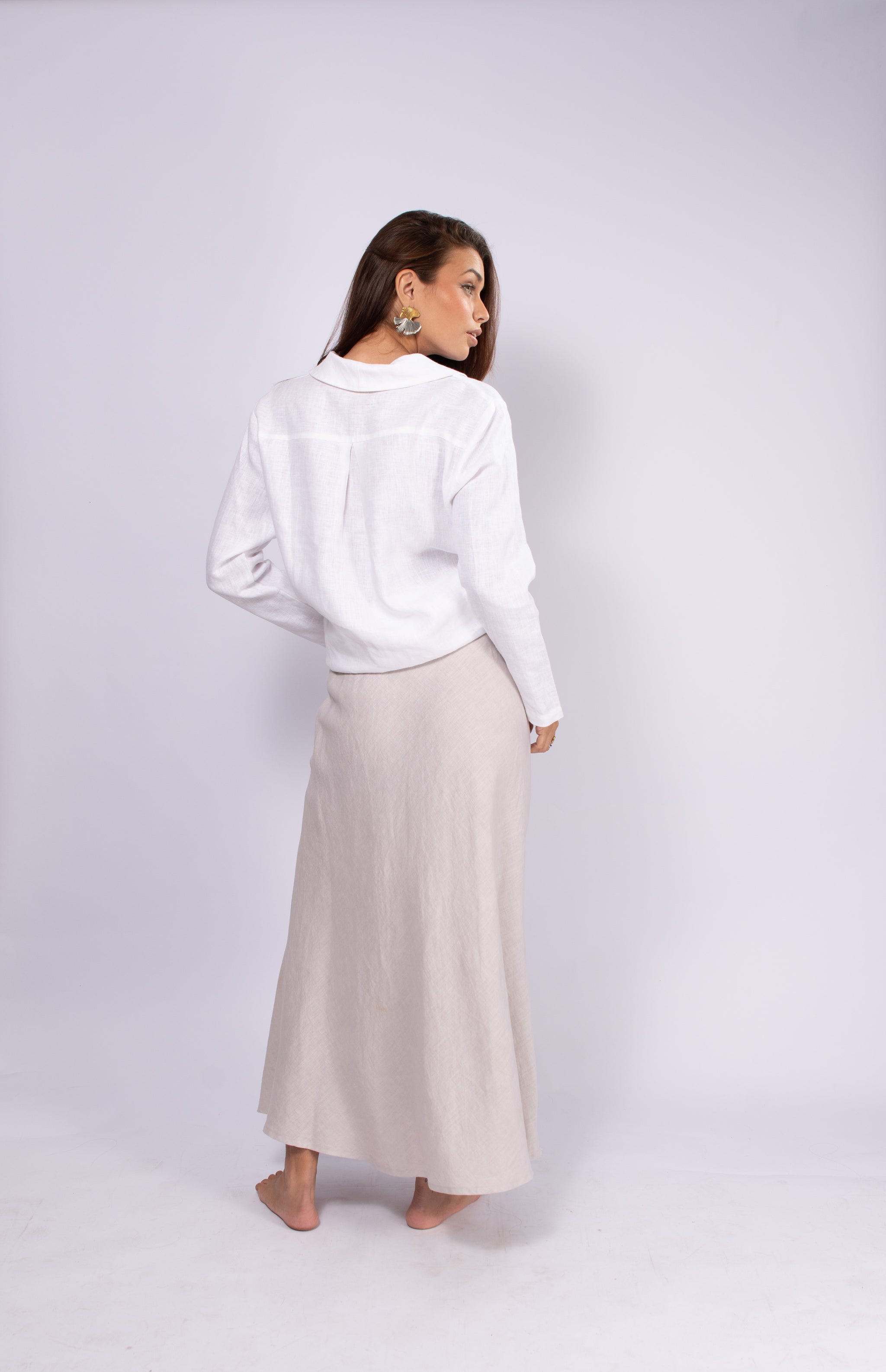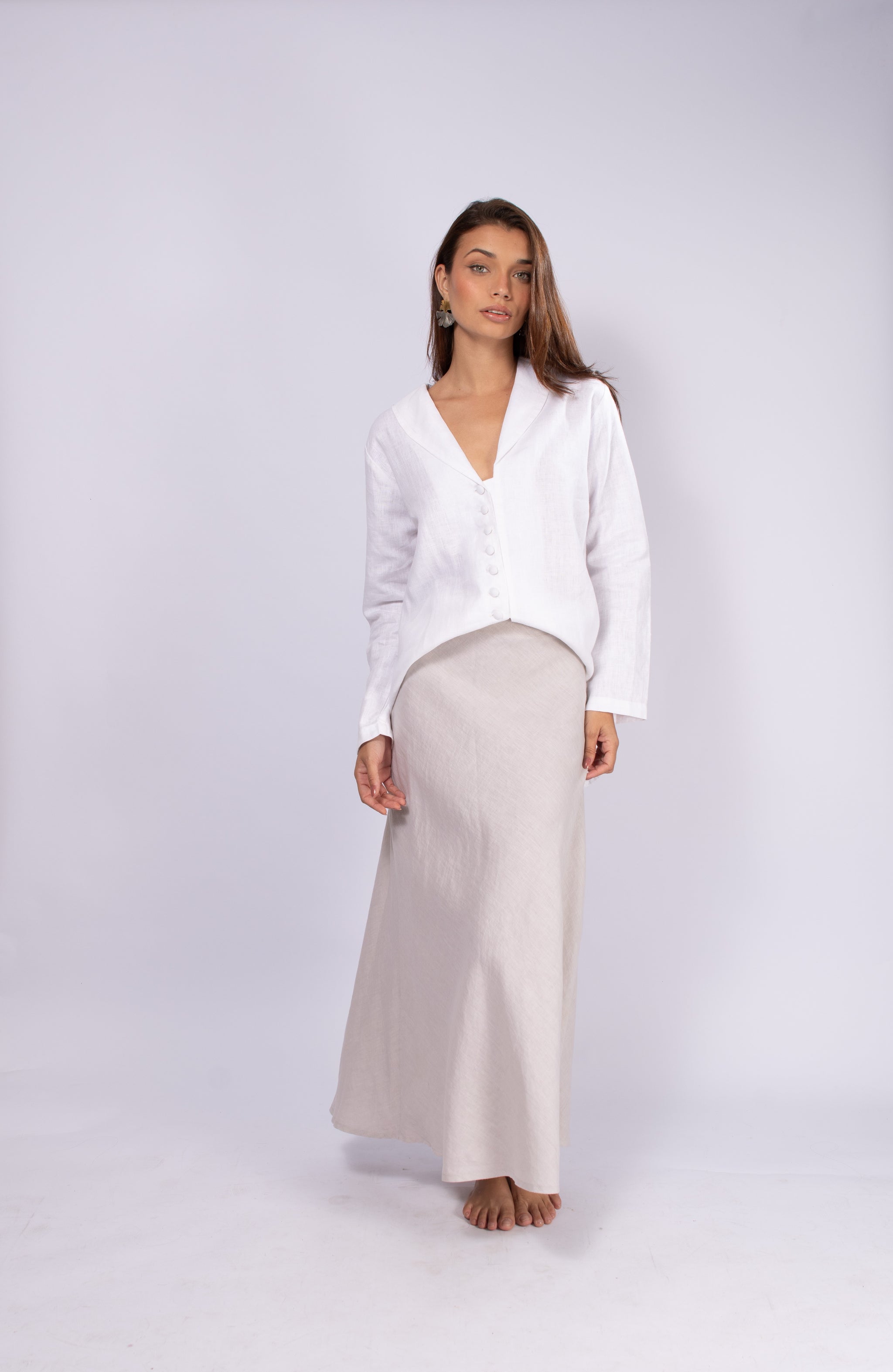 A Saia Varadero é a personificação do movimento e da leveza, ideal para mulheres que buscam peças que realcem a feminilidade com naturalidade. Confeccionada em linho puro e com a modelagem evasê, alonga a silhueta e oferece um caimento fluido, criando um visual harmonioso e elegante. O tecido sutilmente texturizado confere um toque de autenticidade, enquanto o comprimento alongado traz uma sofisticação atemporal. Use-a com blusas delicadas e rasteiras para passeios ao ar livre ou aposte em camisas ajustadas e sandálias de salto para uma elegância mais estruturada.