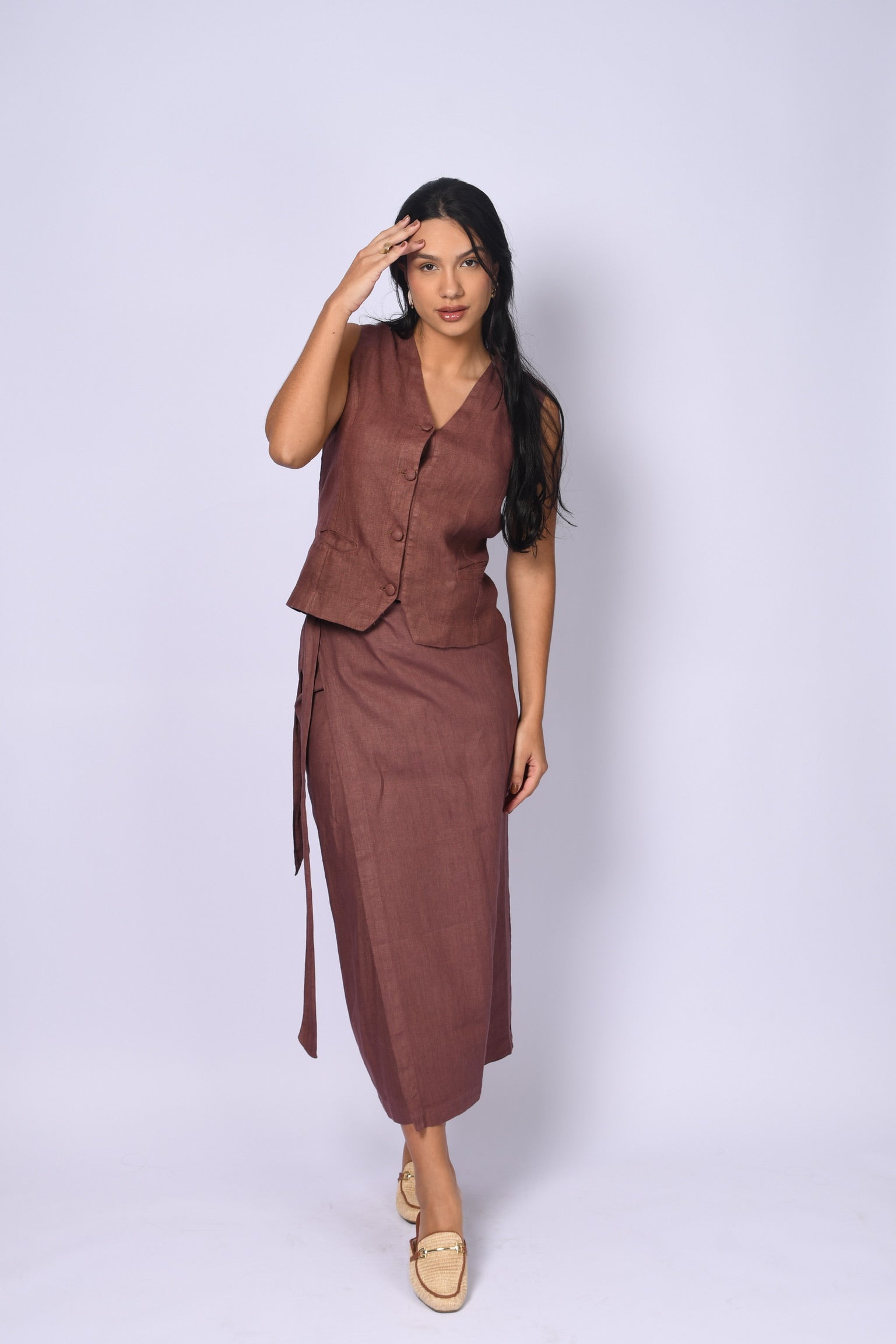 Crafted from pure linen, our Oxford vest perfectly combines elegance and comfort in one piece, making it ideal for women who appreciate timeless, high-quality fashion. With a V-neck that elongates the silhouette and provides a refined fit, it has covered front buttons, giving it a touch of sophistication and visual cohesion. Its sleeveless design and lightweight fabric make it a versatile piece for a variety of occasions and seasons. Add a touch of relaxed elegance to your wardrobe with our Oxford Vest.