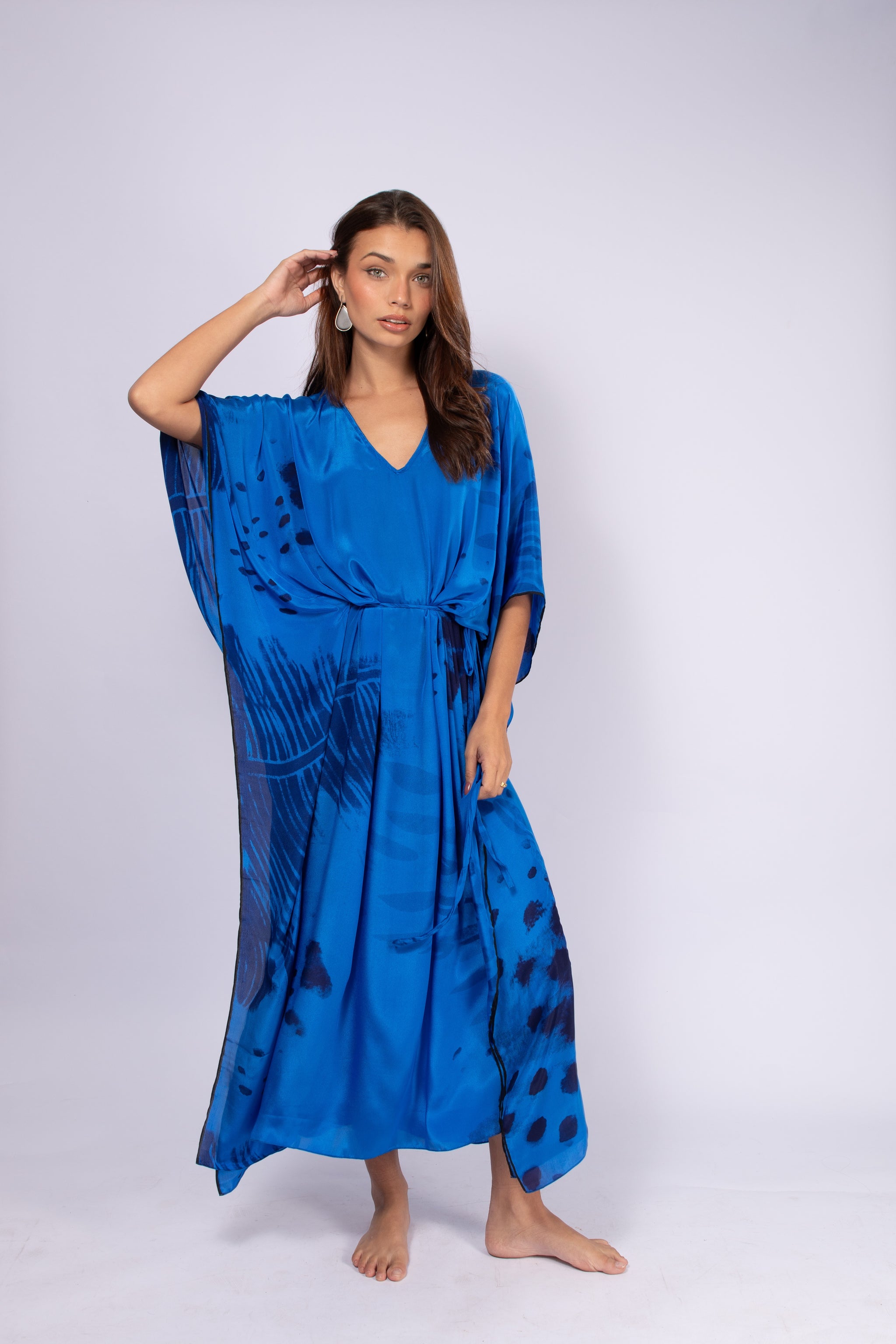 Envolva‑se na elegância exclusiva do Kaftan Ágios Tons de Azul, uma peça confeccionada em seda pura importada com estampa única desenvolvida para realçar a beleza e a sofisticação da mulher moderna. A combinação suave de tons azulados transmite serenidade com presença marcante.