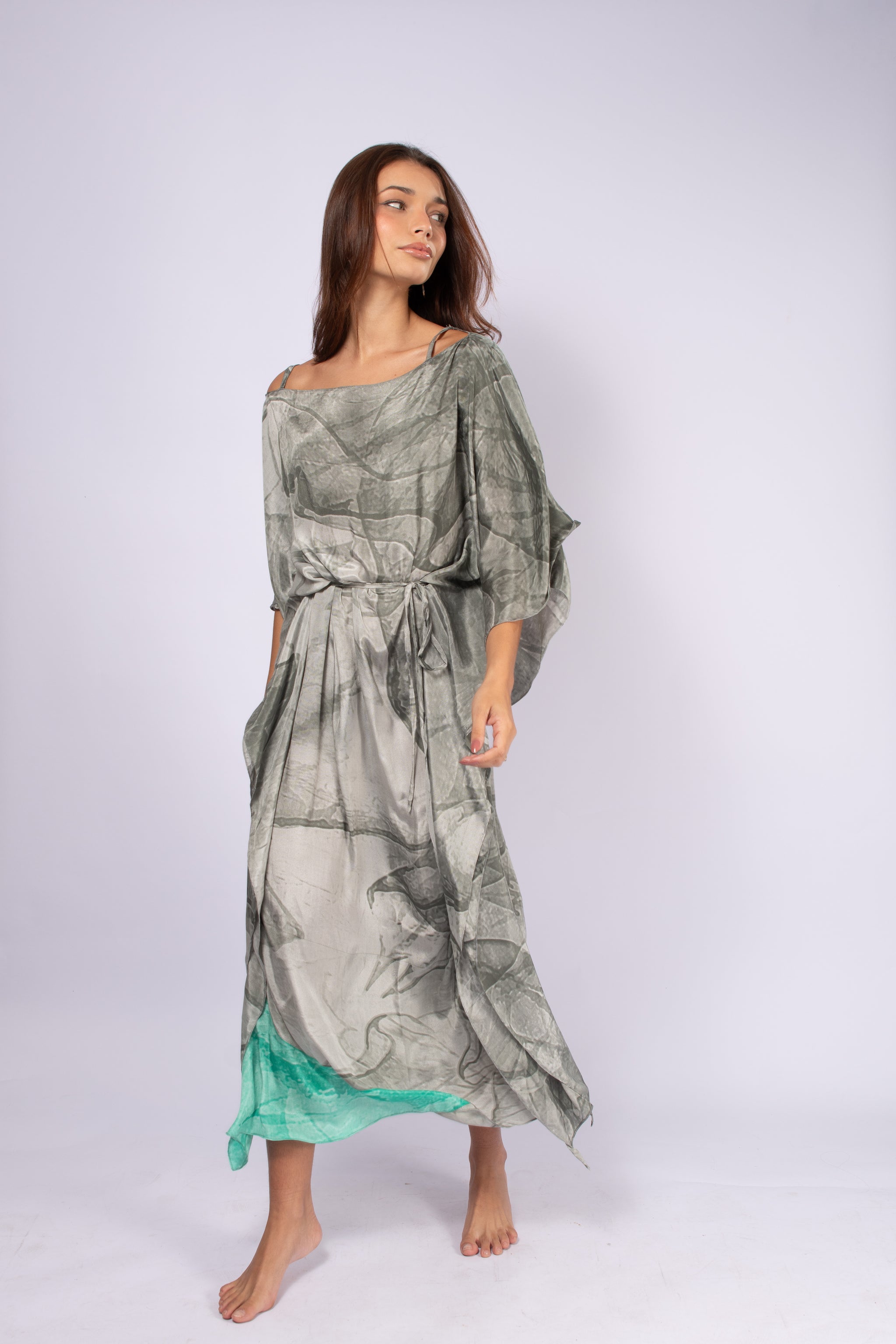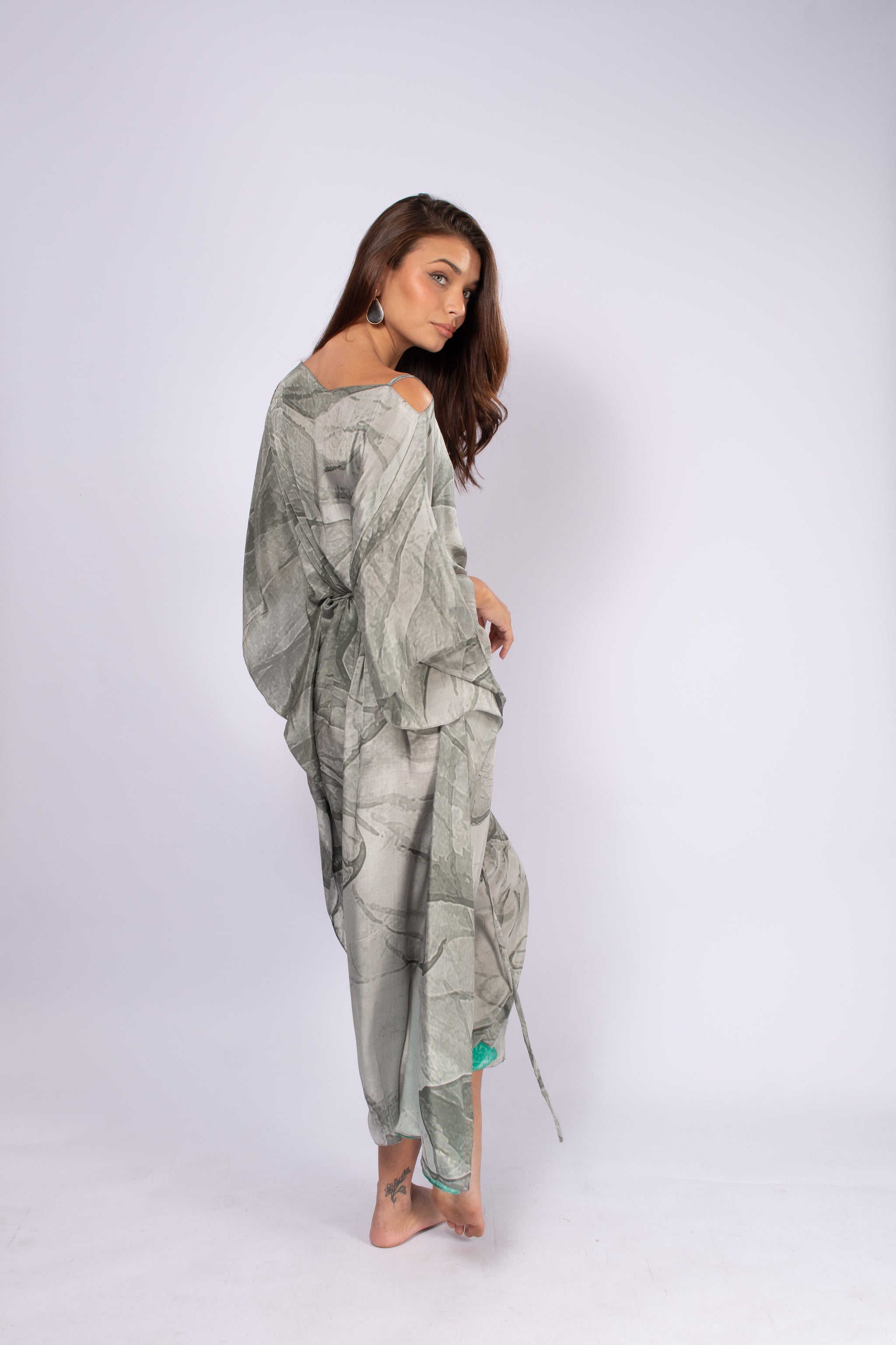 Envolva-se na elegância contemporânea do Kaftan Java, onde os tons sutis de cinza se fundem com nuances frescas de verde água, criando uma paleta harmoniosa que transmite serenidade, sofisticação e presença.